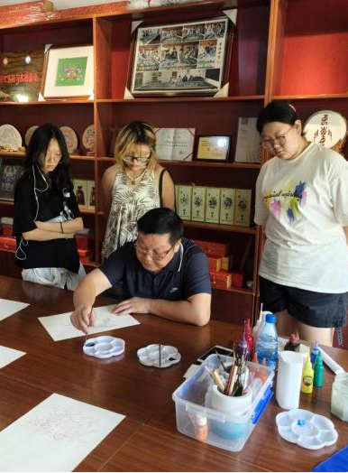 此次写生实践师生们有幸参观了第三代非遗苗画传承人梁颂德老师的工作 室,并在第四代非遗苗画传承人梁金翠老师的指导下,亲自体验了苗画的绘制过 程。一笔一画间,逐渐呈现出的绚丽图案,不仅让同学们感受到了苗画背后的故 事和文化,更让他们对传统技艺产生了深深的敬畏和珍视。