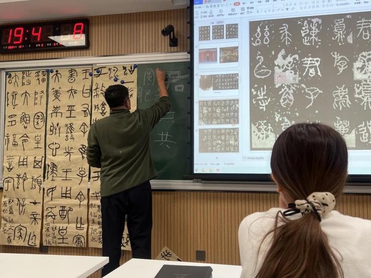 文学院姜勇教授在《中国历代碑帖于书法》课程开班仪式上介绍道书法是中国独有的艺术门类,贯穿古今,且被视为“中国文化核心的核心”,并密切关联着历史、文物、文化、艺术与审美等多门学科,属于一综合性极强的艺术门类。并阐明本课程的教学目的是使学生了解到中国书法艺术的两大重要物质载体“碑”与“帖”,进而掌握该领域的主要研究对象和研究方法。课程中,姜勇老师鼓励同学们利用课余时间学习书法,并结合自己日常临摹作品和自身学习感悟与同学们分享了碑帖临摹的学习方法,培养了学生的艺术兴趣,拓展了专业视野。