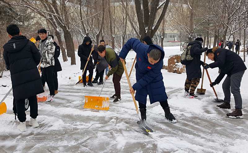 在12月21日周五中午,开展扫雪活动,团学组织带领2018级同学对体育馆前的积雪进行了及时彻底的清扫。